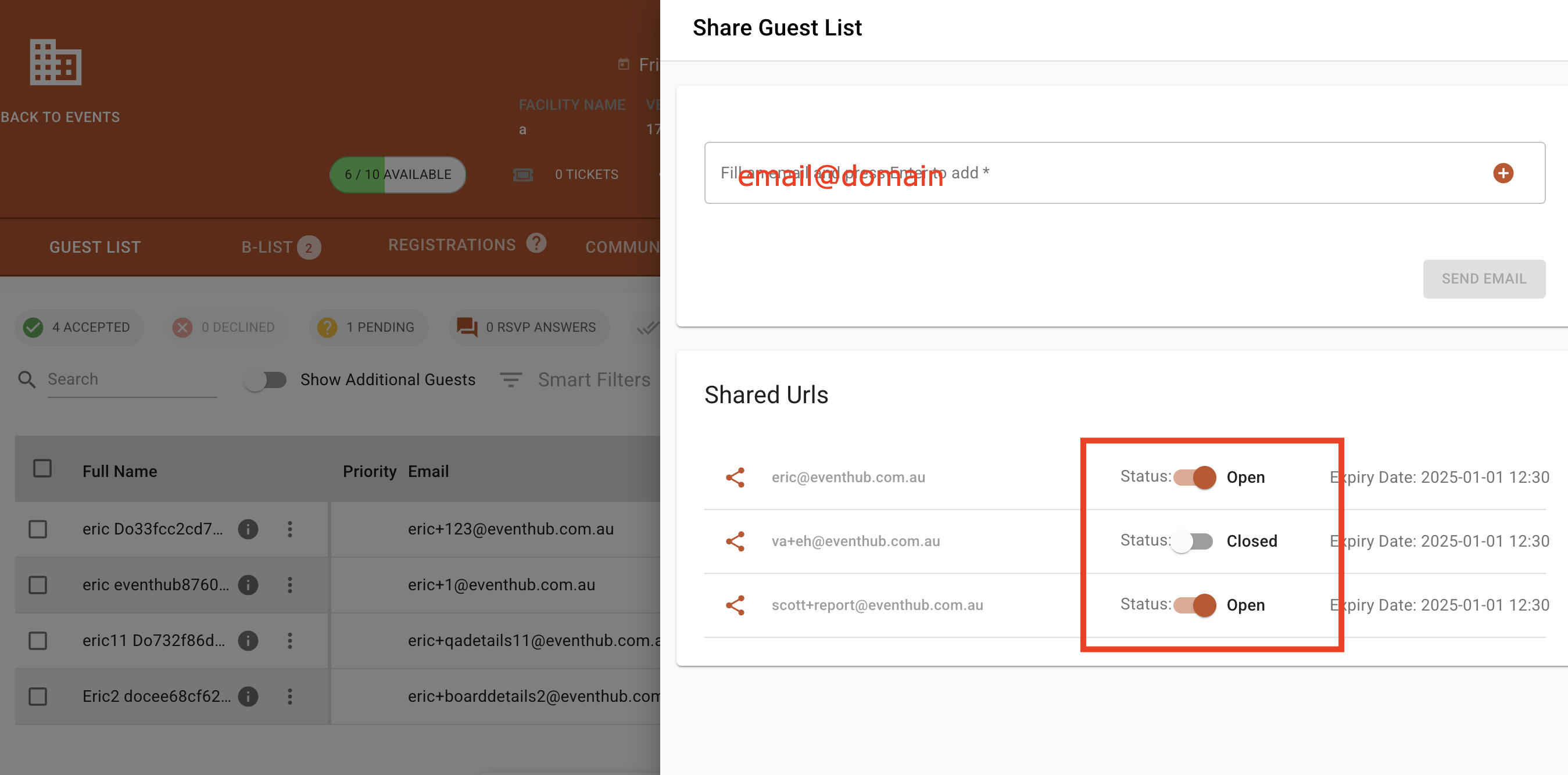 Any email added can be turned off at any time and will expire 7 days after the event date.
