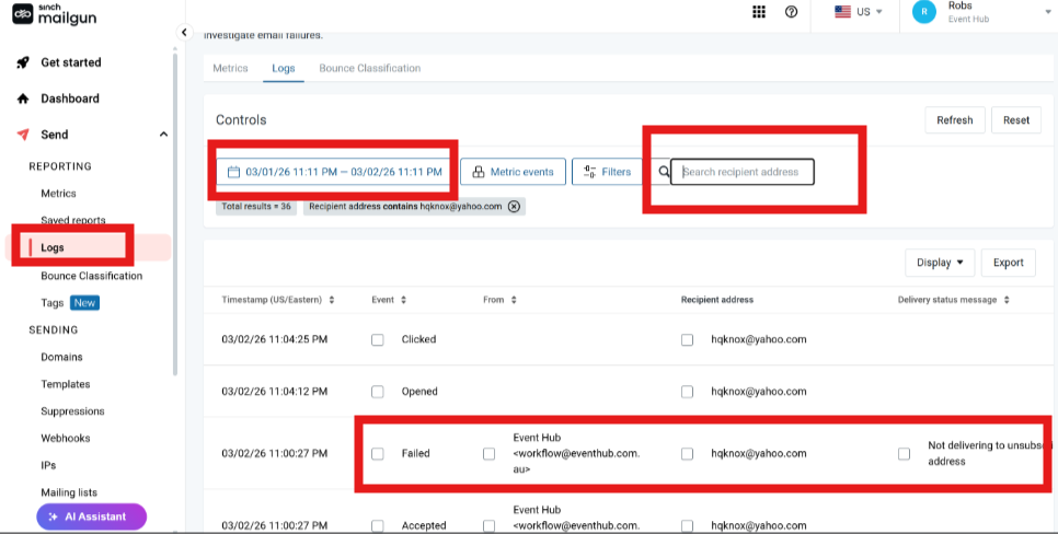 If Mailgun shows a "Fail" OR if it shows "Accepted" but the user still isn't receiving it, escalate to devs via Slack/Jira.